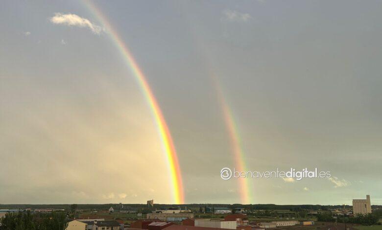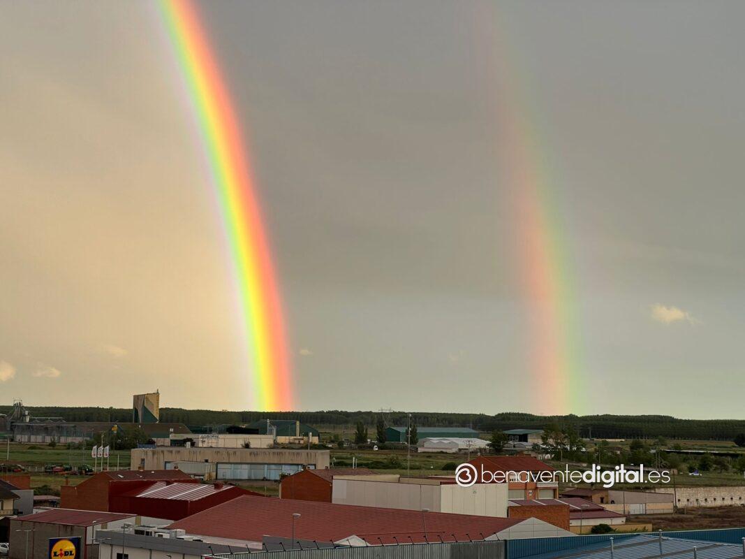 La lluvia de la tarde del lunes ha dejado un arcoíris doble adornando el cielo de Benavente. Este fenómeno óptico, que ocurre cuando la luz del sol se refracta en las gotas de lluvia suspendidas en el aire, crea un efecto visual extraordinario.