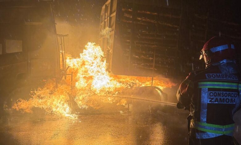 Un camión cargado de madera arde en la A-52 movilizando a los bomberos de Zamora