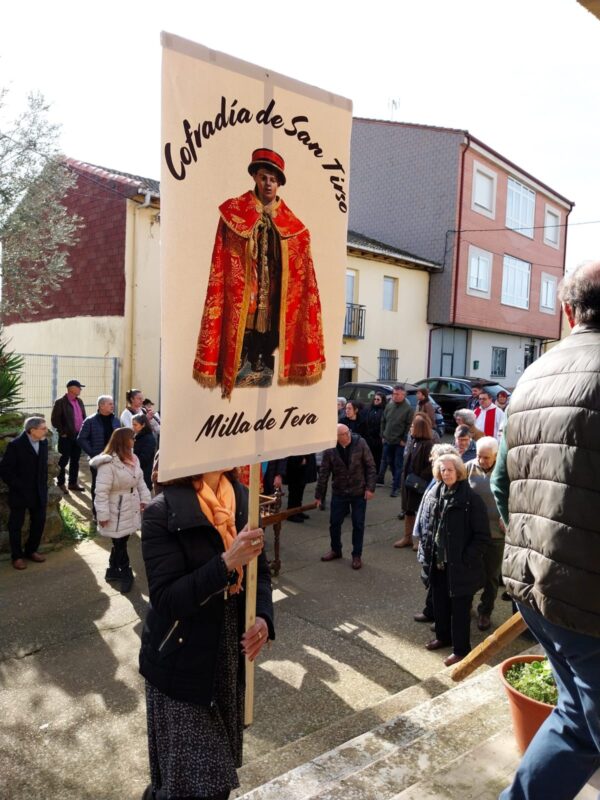 La cofradía de San Tirso, el «Santo Tiso» o «San Tiso» en La Milla de Tera, se remonta al siglo XVII, hace ya casi 400 años y documentalmente obra por escrito en la segunda mitad del siglo XVIII. Figura como cofradía compartiendo devoción con otras dos imágenes más como el Crucificado que sería imagen titular de la cofradía de Santa Cruz y la imagen de San Miguel.