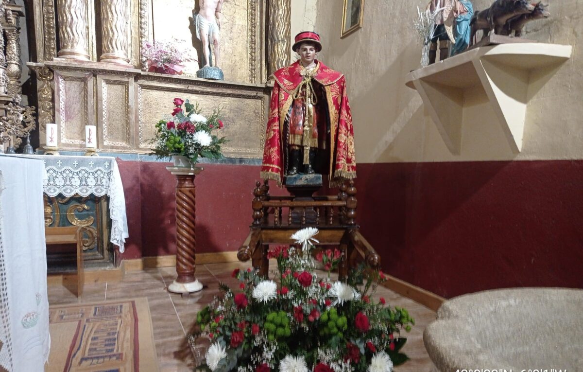 La bella imagen del copatrono representado en una talla policromada del siglo XVII viste con su capa de paño damasquinado con el color rojo de los mártires y bordados de hilo de oro. El aureolado viste sombrero con la cinta de color rojo, ya que por cada fiesta anual se suele cambiar el color de la cinta, esa es la tradición, como lo es la devoción que reúne este santo con casi 400 años de historia, probablemente desde mediados del siglo XVII. No obstante, un siglo más tarde, en la segunda mitad del siglo XVIII las referencias documentales detallan que comparte devociones con otras dos imágenes más como la de Santa Cruz y la de San Miguel, como refiere el informe de cofradías que el Intendente vallisoletano Don Ángel de Bustamante remitió al Consejo de Castilla.