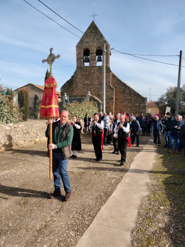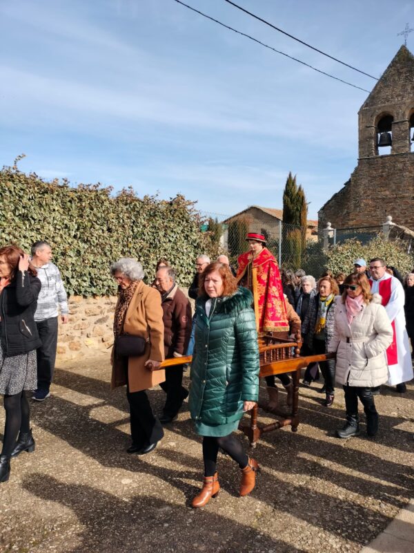 A la voz de «devoto del santo», los portadores de las andas se turnan para llevar la imagen en el desfile procesional, desde la iglesia hasta la desparecida ermita. Un trayecto corto, pero que se hace más largo ante la multitud de detenciones en el camino. Mientras los cánticos y rezos se suceden, el incesante repique de campanas y disparo de cohetes, junto a los sones musicales del grupo la Trasga, revisten de solemnidad esta procesión que concluye con la misa en honor al santo y el beso de sus reliquias.