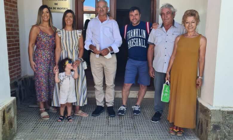Como oficiante de la ceremonia actuó el alcade Lázaro Zarza quien posa con los nuevos contrayentes a las puertas de la Casa Consistorial de Friera de Valverde.