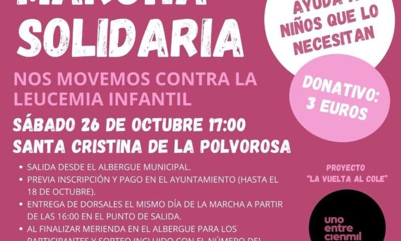Un total de 350 personas se han inscrito para participar en la marcha solidaria contra la leucemia infantil organizada para el próximo sábado 26 de octubre en Santa Cristina de la Polvorosa, confirmó a Benavente Digital el alcalde, Salvador Domínguez, apuntando a que el registro de inscripciones se ha cerrado el pasado viernes, como se indicaba en la cartelería de la actividad.