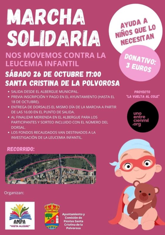 «Nos movemos contra la leucemia infantil» partirá este sábado 26 de octubre, a las 17:00 horas, desde el albergue municipal, para emprender un periplo por la avenida de la Constitución, campo de fútbol, inmediaciones de las piscinas y la senda ribereña del río Órbigo frente al casco urbano. Al finalizar el recorrido, los participantes cuentan con un sorteo incluido con el número del dorsal, así como está prevista una merienda para todos los inscritos.
