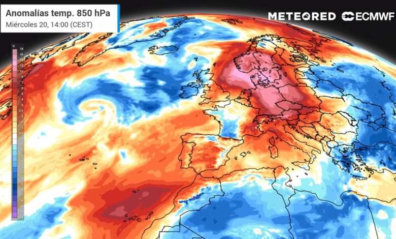 Mañana la DANA continuará acercándose a la Península y ya se situará entre Galicia y la Bretaña, empujando aire muy cálido hacia Reino Unido y Europa. La bajada de temperaturas se extenderá al resto de la vertiente cantábrica, norte e interior peninsular. En el valle del Ebro se mantendrán en los 40 ºC, mientras que en el interior de la mitad este rozarán los 38 ºC.