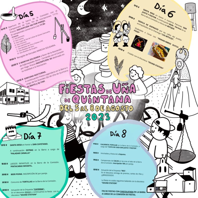 La organización ha previsto para la tarde del sábado 5 de agosto un campeonato de tute, dando paso a la marcha solidaria, una gymkana nocturna y sesión de baile con los dj´s locales Mayo y Yimi. El domingo 6 de agosto se dedica el programa a los santos Justo y Pastor con actos religiosos y lúdicos en los que se incluyen la rotura de botijos, desfile de disfraces y la verbena con la discoteca Sound Station.