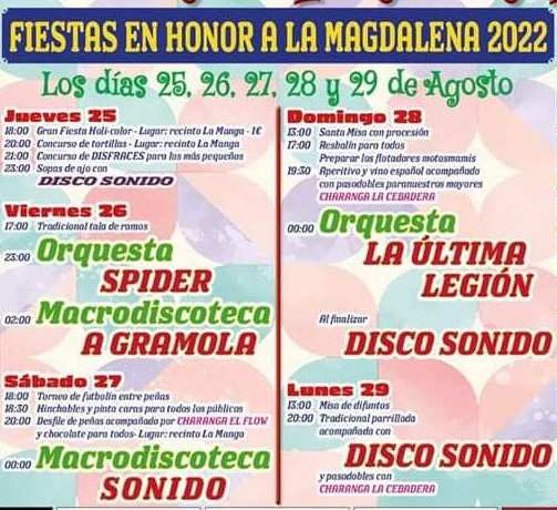 Desde el jueves y hasta el lunes 29 de agosto se organizan una serie de actividades que incluyen la tradicional corta de ramos para ornamentar calles y puertas de las casas de las mozas, concursos, juegos, atracciones infantiles, desfile de peñas, celebraciones religiosas y las verbenas.