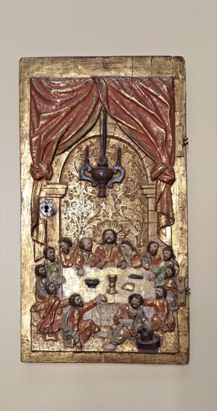 Realizado en relieve y con limitada destreza técnica, tiene sin embargo el valor de su carácter popular. Representa la escena de la Última Cena, en el transcurso de la cual Cristo instituyó la Eucaristía. Se desarrolla en el interior del cenáculo con Jesús en el centro de la mesa, nimbado y los apóstoles rodeándolo. Sobre ellos un arco de medio punto sobre columnas, un ampuloso cortinaje anudado a los flancos y una gran lámpara que cuelga sobre el tablero. El fondo, completamente neutro y decorado con fino pan de oro, impide cualquier atisbo de perspectiva.