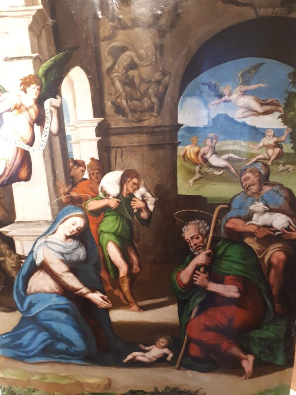 Con una composición en tres planos, con rotunda valoración espacial, enmarcando la escena en una imponente arquitectura clásica. La Virgen María y San José postrados ante el Niño Jesús, en primer término y tras ellos los pastores apareciendo con sus corderos. A la izquierda, en un interesante contraluz, un ángel muestra una filacteria en la que se lee “Gloria in Excelsis Deo”. El vano del arco permite el trabajo paisajístico con la Anunciación a los Pastores.