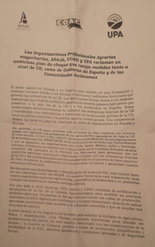 Al finalizar el recorrido se procedía a la lectura de un manifiesto de las organizaciones profesionales agrarias convocantes, Asaja, Coag y Upa, reclamando un ambicioso plan de choque que recoja medidas tanto a nivel de UE, como de Gobierno de España y de las Comunidades Autónomas.