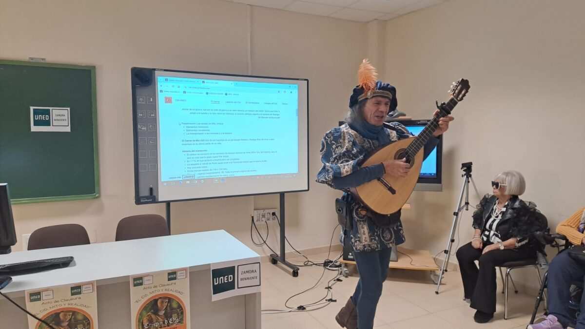 El acto finalizaba con la actuación de José Manuel Ramos Alonso, actor y juglar que bajo el nombre Crispín D’ Olot ha recorrido numerosos países y ha recibido grandes reconocimientos. Esta tarde, en la sede de la UNED Benavente, realizó una demostración su arte interpretando los instrumentos tradicionales mientras recitaba a verso todo tipo de poesía medieval, entre ellos «El romance de las quejas de Doña Urraca», un cantar de gesta hoy casi perdido.