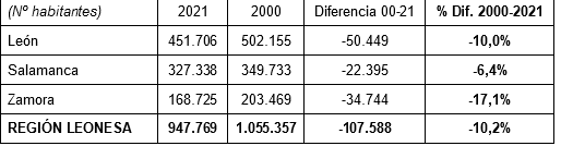 Una pérdida de habitantes a la que se suman las proyecciones de población realizadas por el INE para los próximos quince años, que estiman que la Región Leonesa perderá 77.365 habitantes en los próximos quince años, siendo León, Zamora y Salamanca las tres provincias de la comunidad que más habitantes perderán en términos absolutos, siendo asimismo la Región Leonesa el territorio de España que más habitantes perderá según dichas proyecciones.