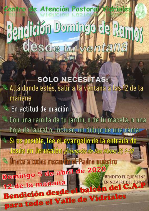 Aunque estemos confinados en nuestras casas, siguen siendo unos días importantes con el inicio de la Semana Santa. Por ello, desde el Centro de Atención Pastoral Vidrialés, invitan a celebrar la Bendición del Domingo de Ramos desde sus ventanas.