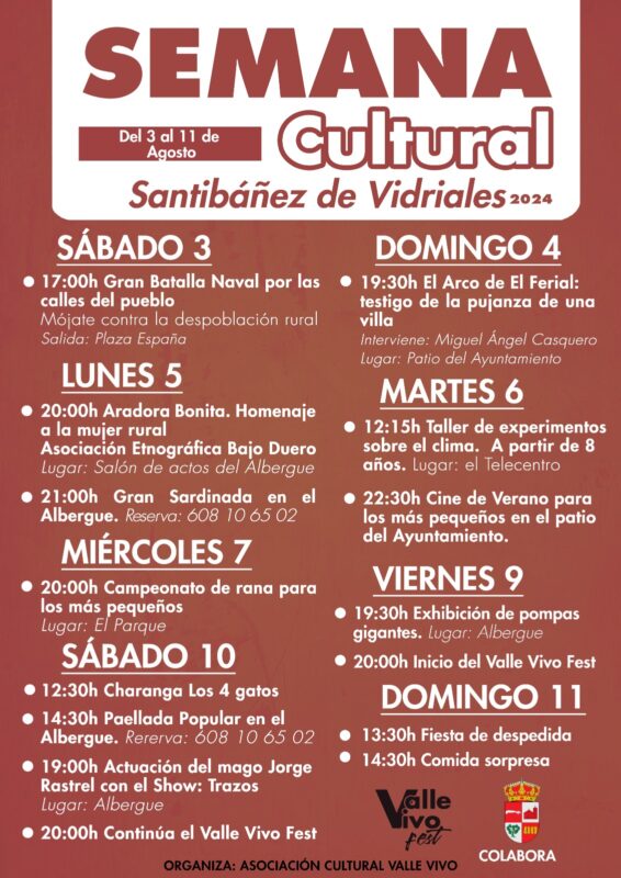 El abanico de la semana cultural se extiende durante los días 3 al 11 de agosto e incluye concursos, juegos, actuaciones musicales, una sardinada, paellada, talleres, cine de verano, espectáculo de magia e, incluso, una charla sobre uno de los monumentos más emblemáticos de Santibáñez, el Arco de El Ferial, que acaba de cumplir 100 años y ha sido testigo mudo de la pujanza de la villa de Santibáñez. El abanico de actividades pliega sus tablas con el Festival Valle Vivo Fest.