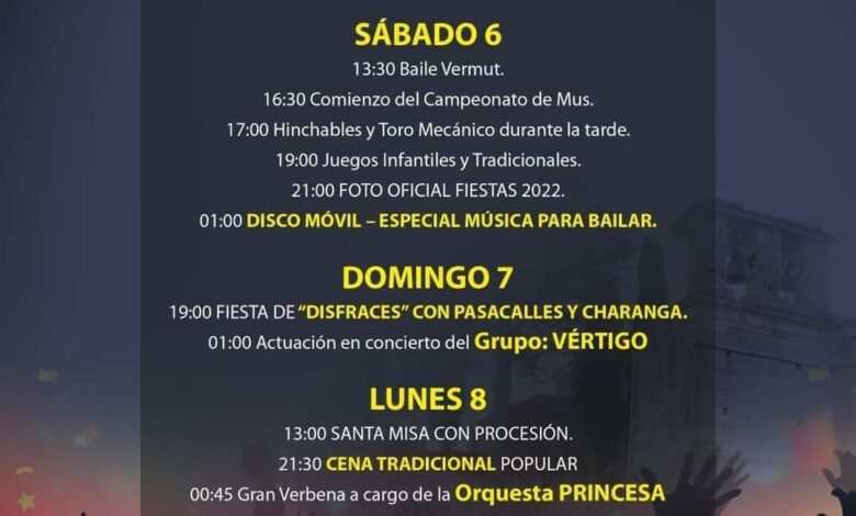 Un campeonato de tute abre las tablas del abanico programático en la noche de este viernes, dando paso a una sesión de baile con discoteca móvil. En la jornada del sábado 6 de agosto se organiza un baile vermouth y en la tarde campeonato de mus, atracciones, juegos infantiles y tradicionales, photocall, y baile con disco móvil.