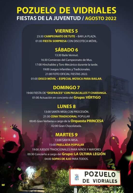 La localidad de Pozuelo de Vidriales ya huele a fiesta, los últimos preparativos se aceleran por parte de la juventud como organizadora de estos festejos bautizados con su nombre. Desde el viernes 5 de agosto y hasta el martes día 9 se abre un extenso abanico de actos cuyo protagonista lo constituye la sana diversión en este apacible y hospitalario pueblo vidrialés.