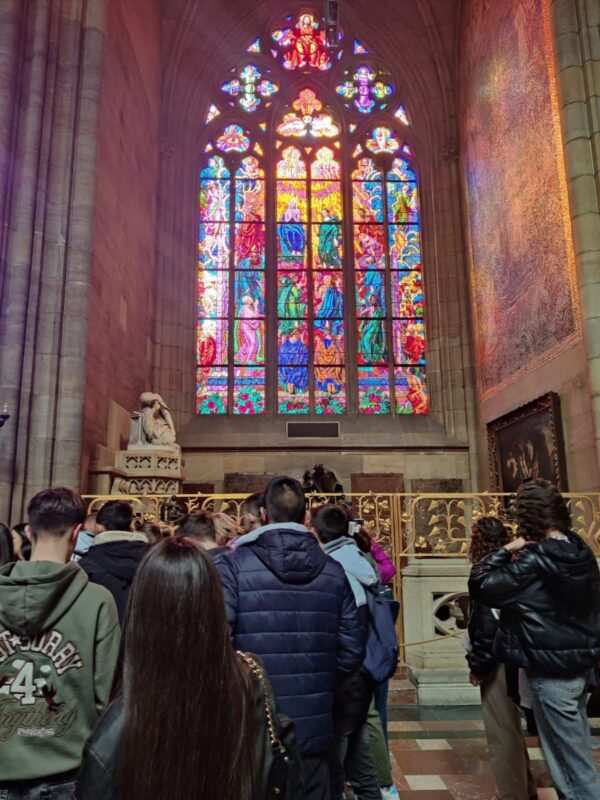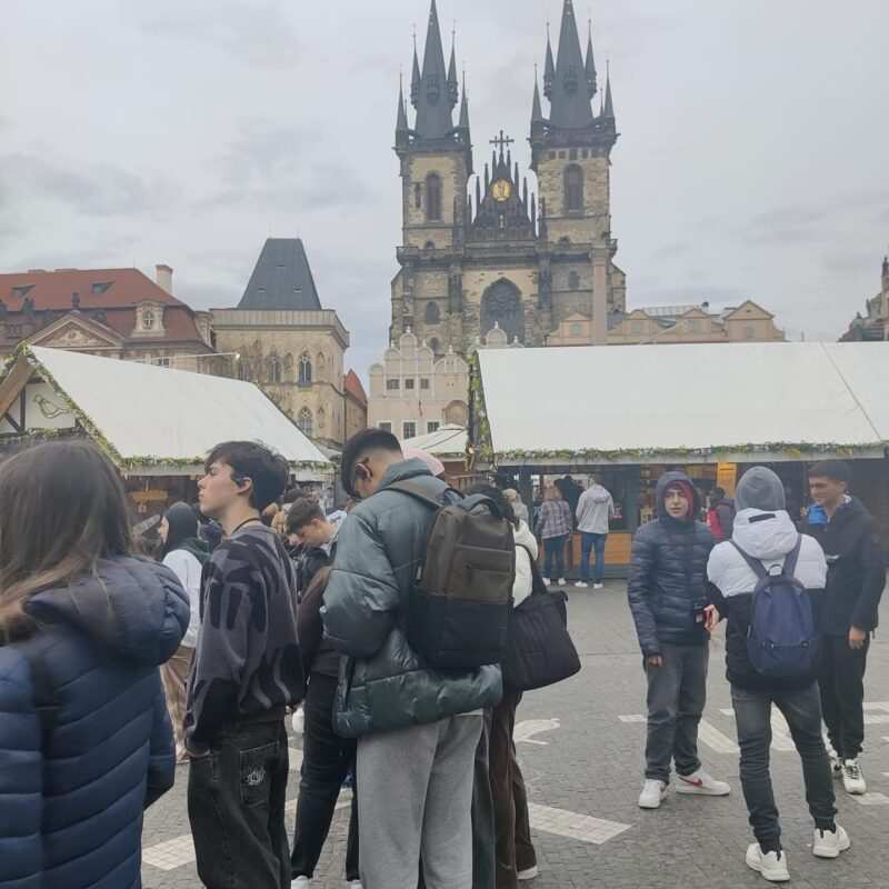 El viaje comenzó en la icónica Plaza Wenceslao, donde el reloj astronómico dio la bienvenida al grupo con sus intricadas piezas y su historia milenaria. La exploración de la Plaza de la Ciudad Vieja y el Barrio Judío sumergió a los estudiantes en las capas de historia que conforman la identidad de Praga. Allí visitaron la Iglesia de Santiago y la imponente Iglesia de Tyn.