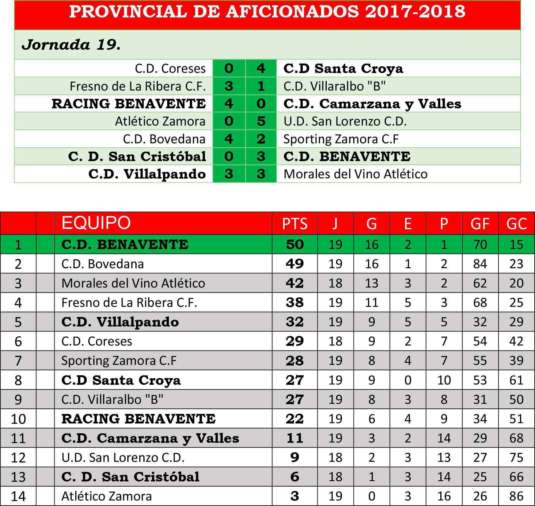 Victoria contundente del Racing Club Benavente ante el Camarzana con Modesto como protagonista al lograr dos goles y dos asistencias. Los benaventanos salieron a por los tres puntos desde el inicio y a los dos minutos ya lograron el primer gol al rematar Modesto de cabeza un gran centro desde la banda derecha obra de Palmero. A partir de ahí, el conjunto local tuvo el control total del partido realizando un buen juego combinativo y también llevando peligro al contraataque, mientras que los del Valle del Tera lo intentaban a través de desplazamientos en largo buscando la espalda de la defensa benaventana. Mario Bolaños pudo marcar el segundo gol para el conjunto racinguista en dos ocasiones, al igual que Modesto, al que le sería anulado un gol al rematar de cabeza un saque de esquina por una teórica falta de Víctor a un defensor visitante, acción muy protestada por el conjunto local. Finalmente sería Adrián el que marcara el segundo tanto, al aprovechar un pase elevado de Modesto, quedando solo ante el portero y definiendo a gol sensacionalmente con un disparo potente cruzado que pegó en el poste antes de entrar, llegando así con el marcador de 2-0 al descanso.