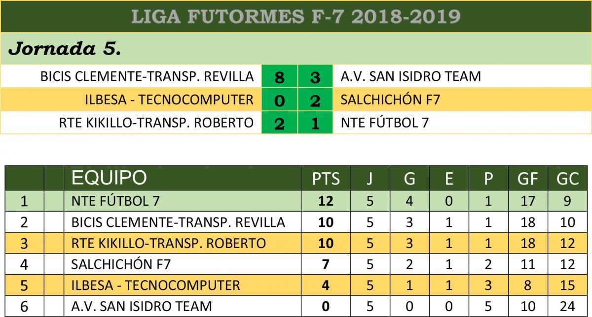 En fútbol 7 se acortan las diferencias en la parte alta de la tabla con el tropiezo del líder que caía ante el Restaurante Kikillo-Transportes Roberto por 0-2 y permite a la clasificación compromirso y acortar diferencias con respecto al NTE Fútbol 7 que contaba sus partidos por victorias.