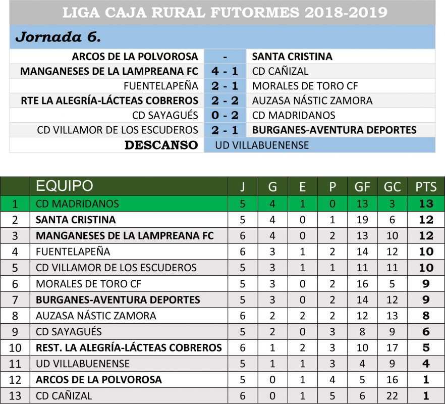 Semana pasada por agua la de la sexta en la Liga Caja Rural de Futormes que impidió que el partido entre el C.D Arcos de la Polvorosa y el C.D Santa Cristina se pudiera celebrar por el estado del terreno de juego algo que, por ejemplo, también le pasó al Restaurante la Alegría-Lácteas Cobrero ante el Nastic Zamora. Los de Fuentes de Ropel alquilaron finalmente el campo de juego del Alonso Pimentel para poder jugar y el choque se cerró con empate a dos.