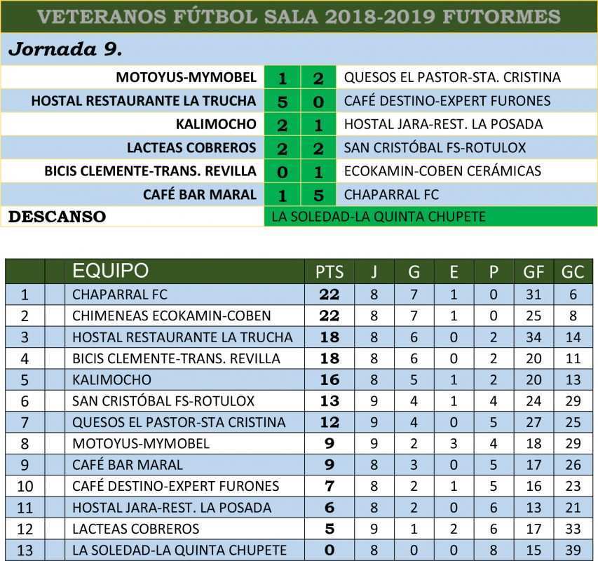 Novena jornada en la Liga Veteranos de fútbol sala y una semana más sin cambios en la cabeza de la tabla donde Chaparral y Chimeneas Ecokamín-Coben Cerámicas siguen empatados a puntos. Ambos equipos solucionaban sus compromisos de la semana con más dificultades el Chimeneas Ecokamín-Coben Cerámicas que se la jugaba ante el tercer clasificado el Bicis Clemente-Transportes Revilla en un partido con suspense hasta el final y que bien pudo acabar en empate. Sin embargo el coolíder fue capaz de rentabilizar la ventaja de un gol y sumar tres nuevos puntos en un gran partido de ambos. Chaparral, por su parte, no tuvo problemas ante el Café Bar Maral al que le endosaba una manita. La misma sufría Café Destino-Expert Furones ante el Restaurante la Trucha, mientras que Queso el Pastor y Kalimocho vencían por la mínima a Motoyus-Mymobel y Hostal Jara. El único empate se lo repartieron Lácteas Cobreros que contra pronóstico logró sacarle un punto al San Cristóbal.