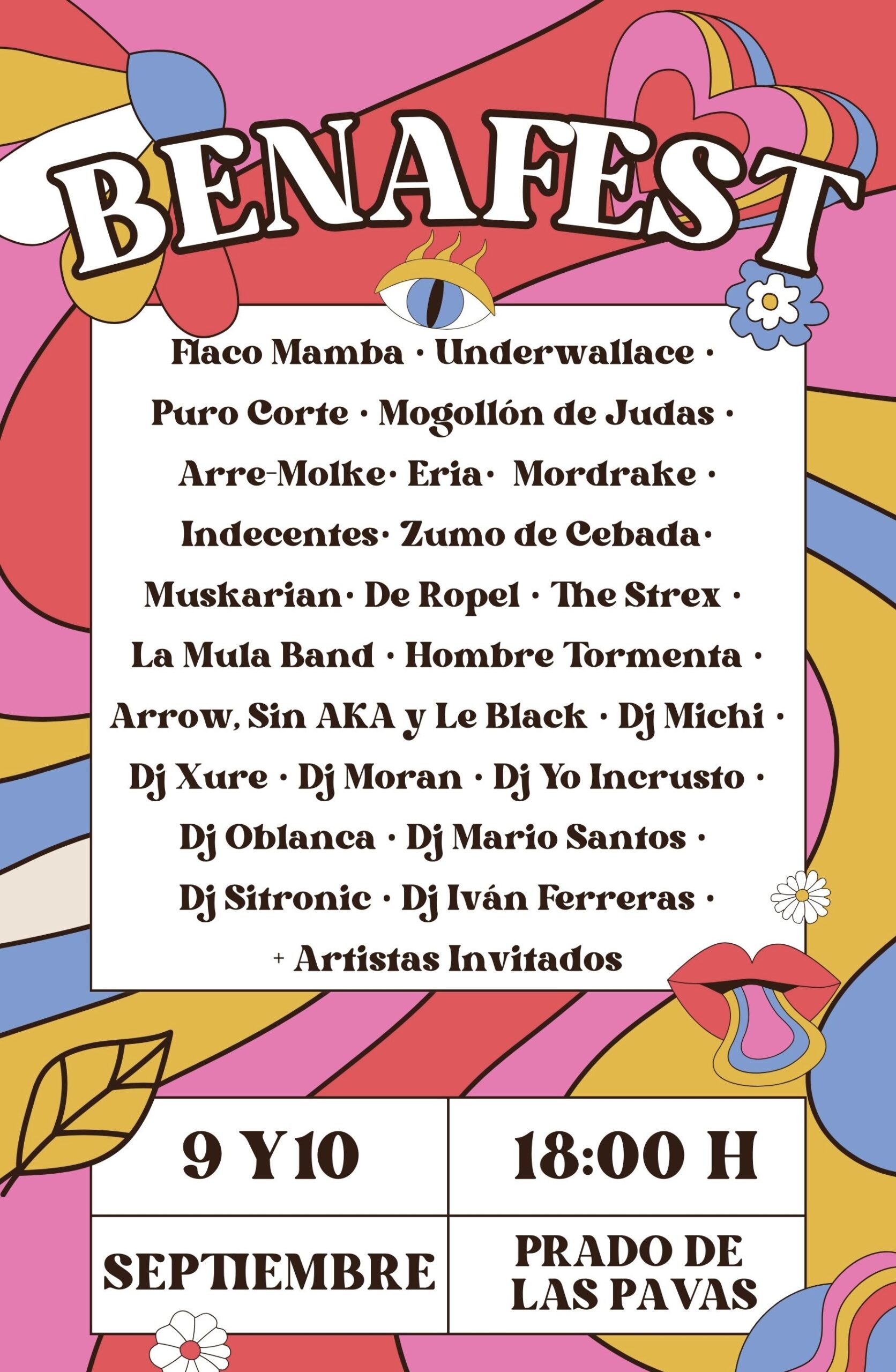 Los artistas confirmados para el ‘BENAFEST’ 2023 son: Underwallace, Flaco Mamba, Puro Corte, Mogollón de Judas, Arre-Molke, Eria, Mordrake, Indecentes, Zumo de Cebada, Muskarian, De Ropel, The Strex, La Mula Band, Hombre Tormenta, Arrow, Sin Aka y Le Black, Dj Michi, Dj Xure, Dj Moran, Dj Yo Incrusto, Dj Iván Ferreras, Dj Sitronic, Dj Mario Santos y Dj Oblanca.