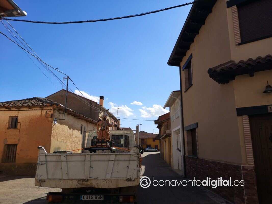 Un grupo de devotos del Padre Eterno, al frente de la mayordoma de la cofradía, Montse Argüello, quiso tener un gesto con los vecinos de Camarzana de Tera, ante la actual situación sanitaria por la pandemia, procesionando la imagen en camión hasta la iglesia.