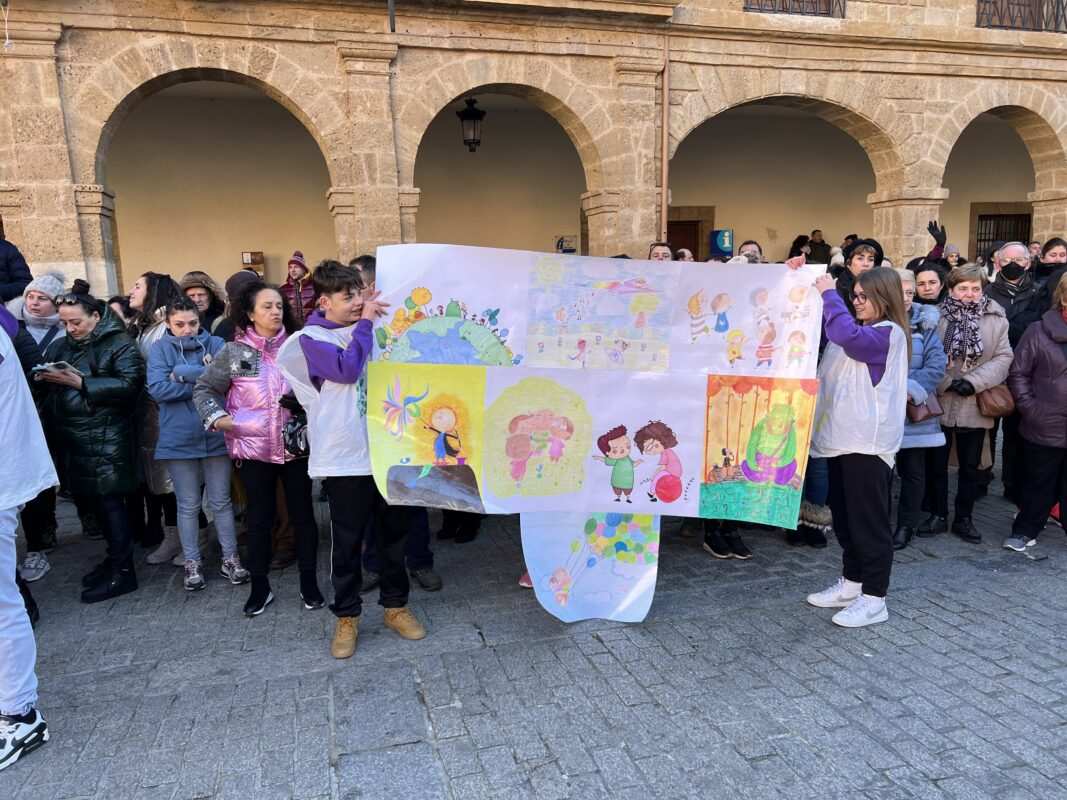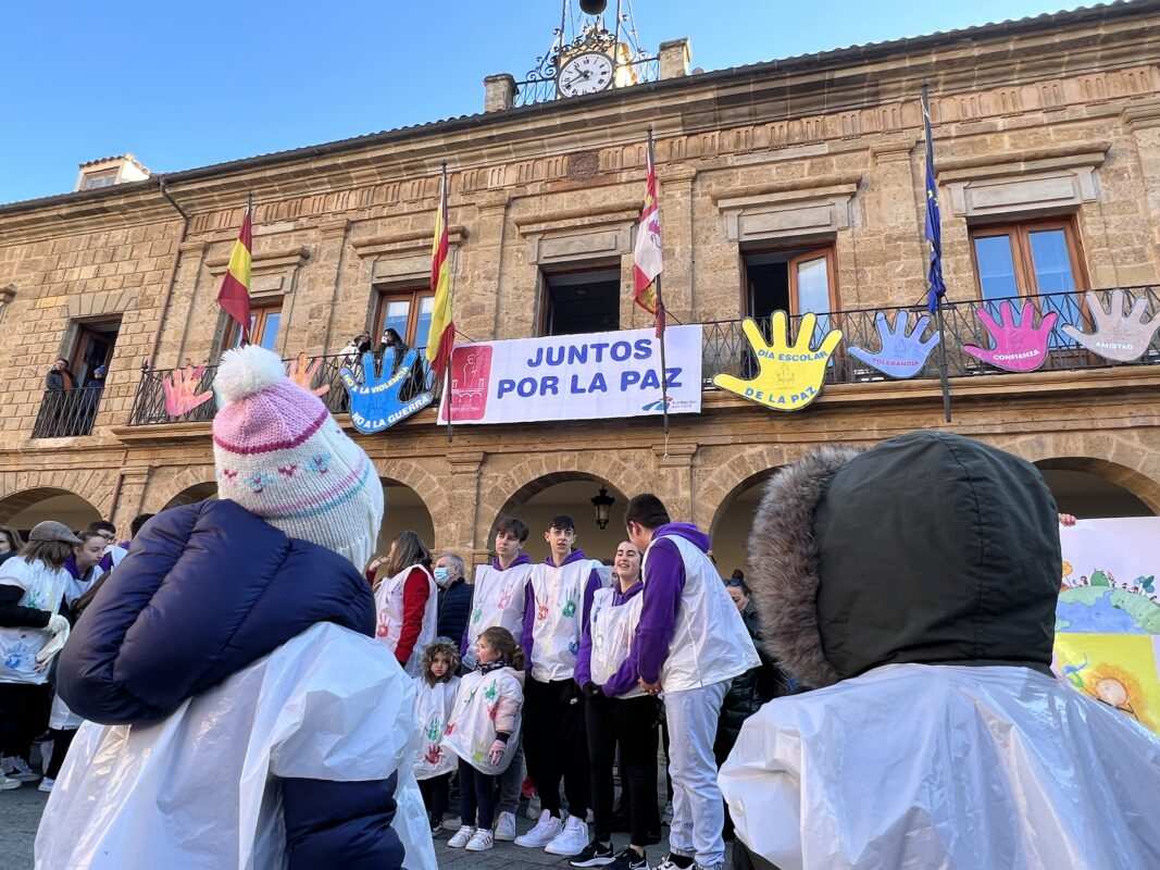 Los balcones del ayuntamiento portaban varias manos en las que se leía amistad, confianza, tolerancia, igualdad o no la violencia y no a la guerra al que se sumaba la pancarta central de juntos por la paz. Alumnos y profesores, ataviados con trajes blancos con manos de colores, quisieron transmitir a través esta coreografía diferentes valores que no pueden faltar así como el respecto entre personas bajo el título: “Vivan las manos de colores”.