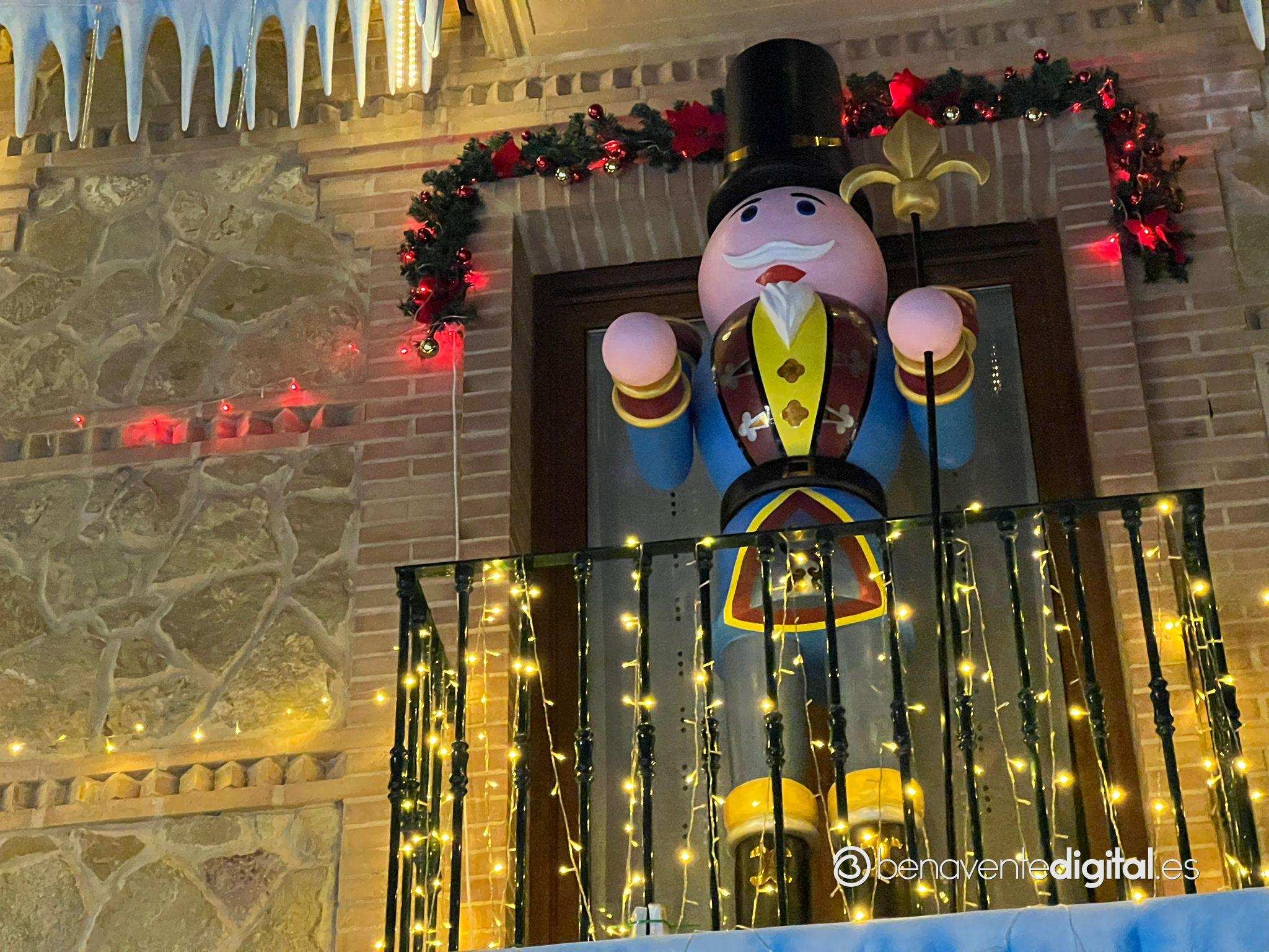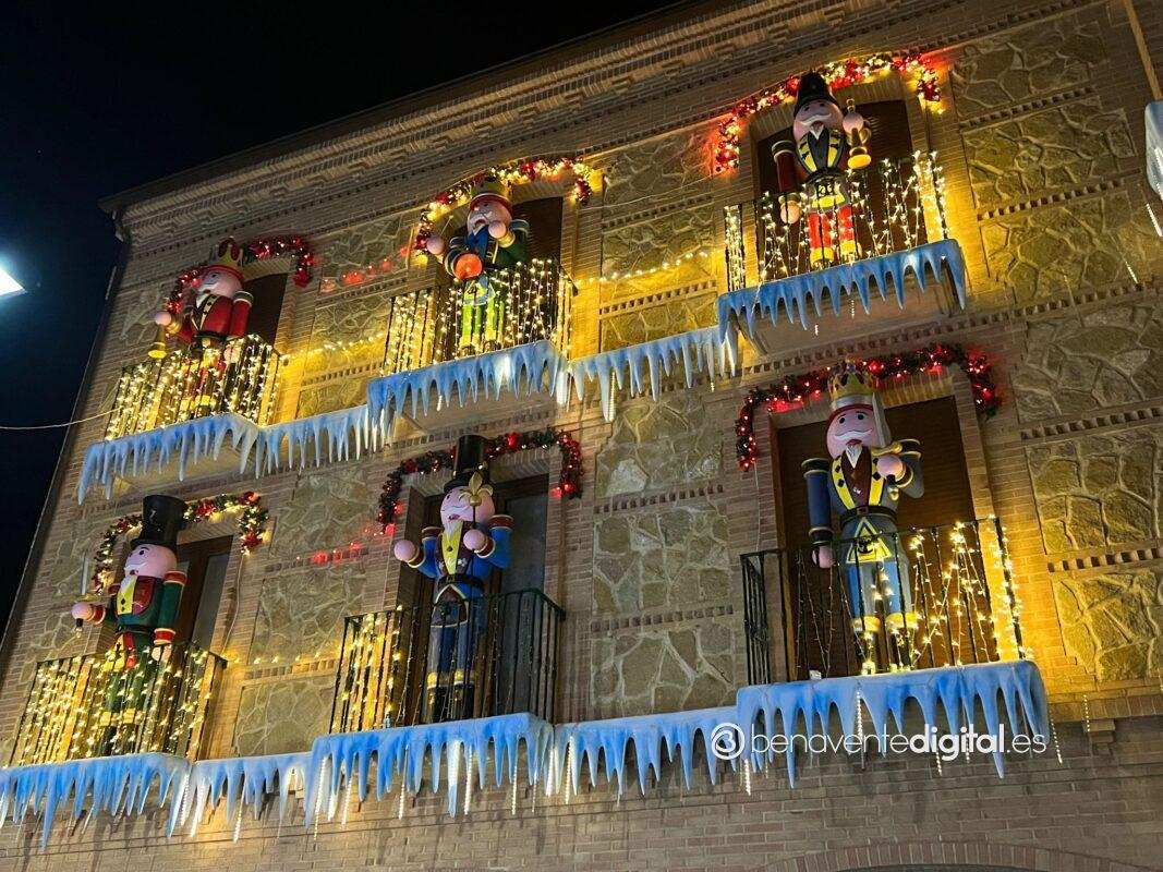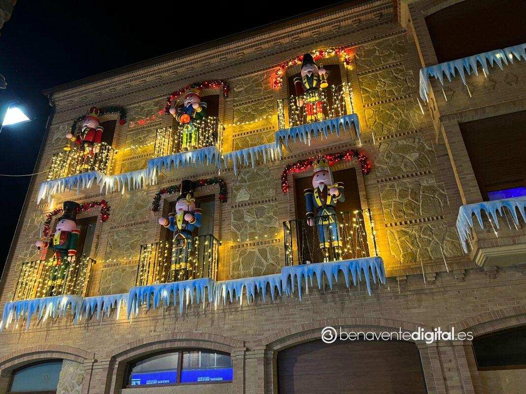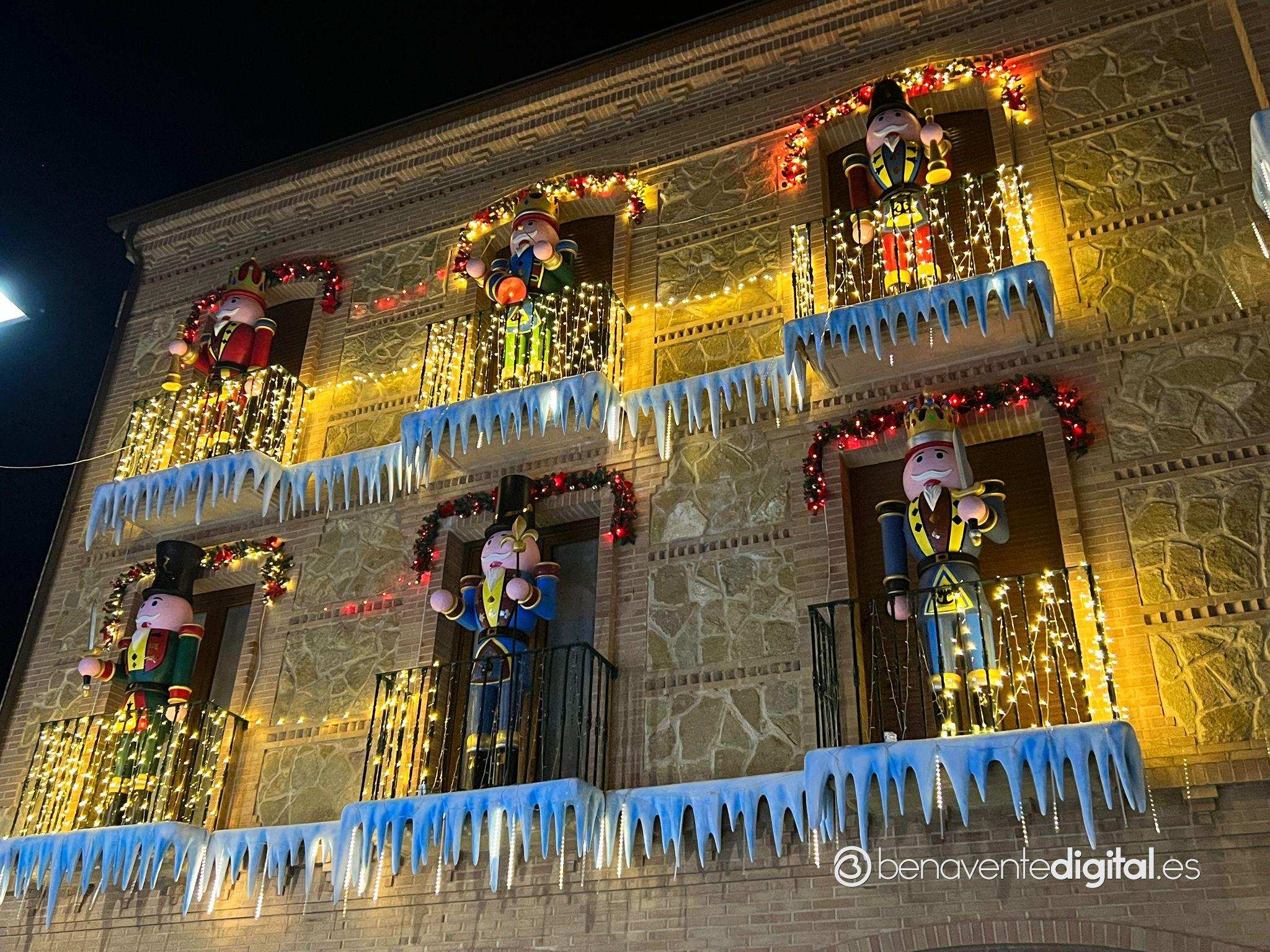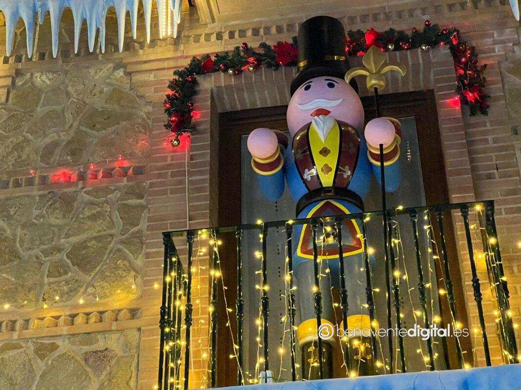 En Benavente, una deslumbrante decoración navideña ha acaparado la atención de todos aquellos que pasan por delante. En la fachada de este edificio, ubicado en la calle de detrás del hospital, se exhiben seis imponentes cascanueces gigantes, cada uno vestido con ropajes de colores distintos, acompañados por una cautivadora exhibición de luces y un encantador paisaje invernal.