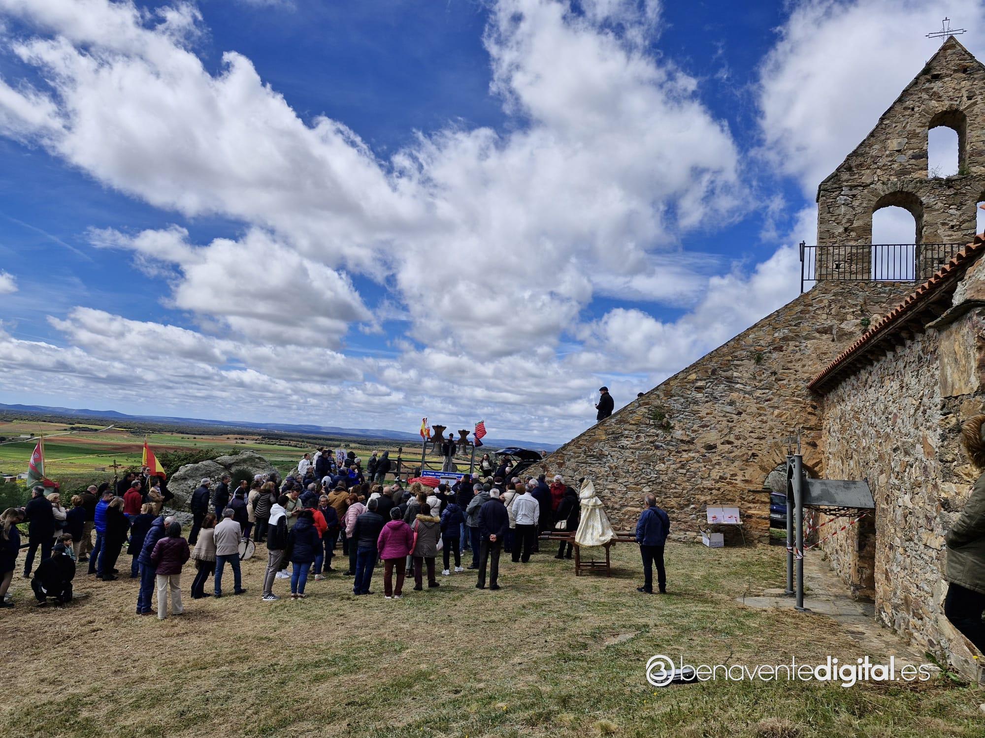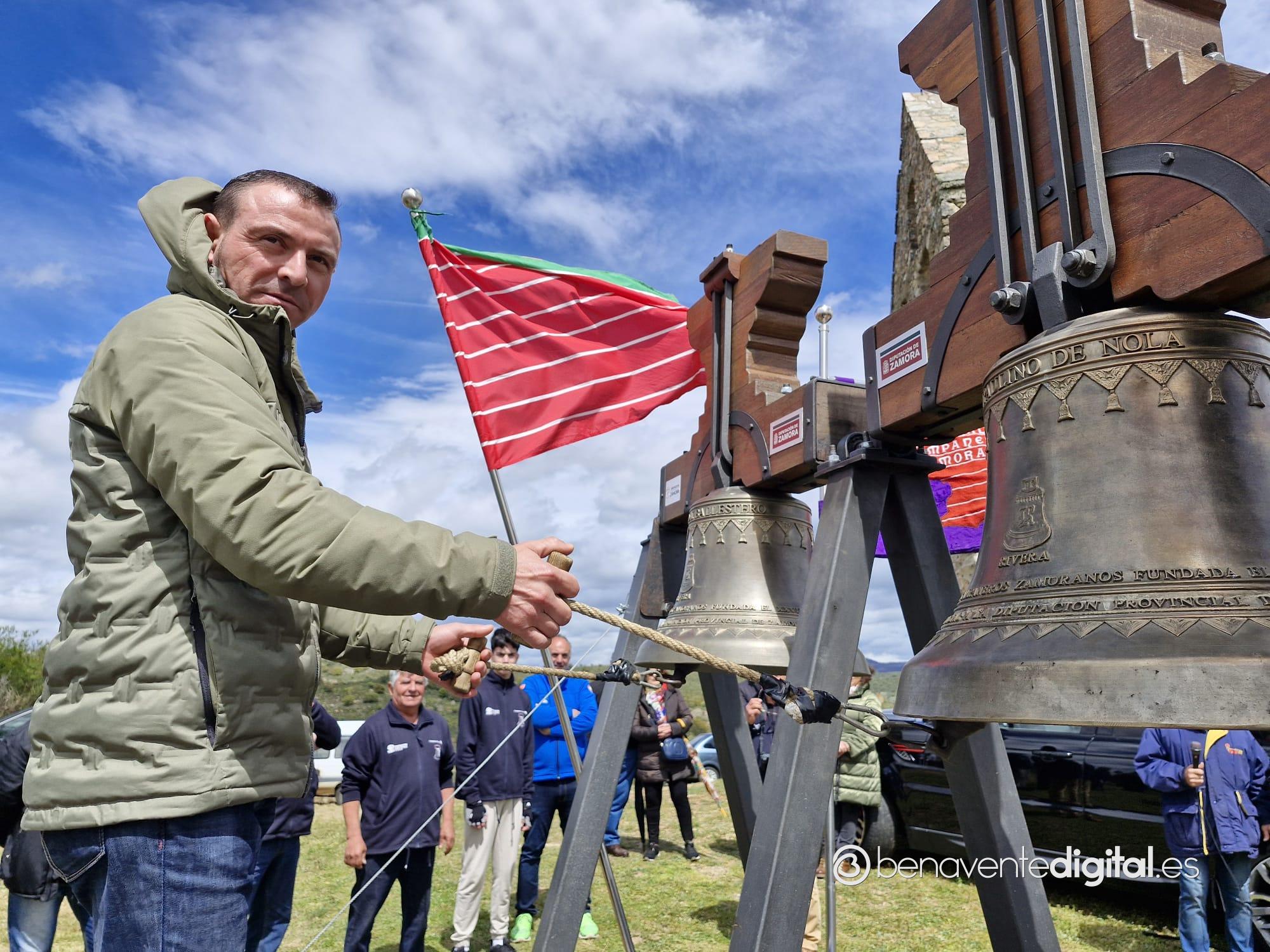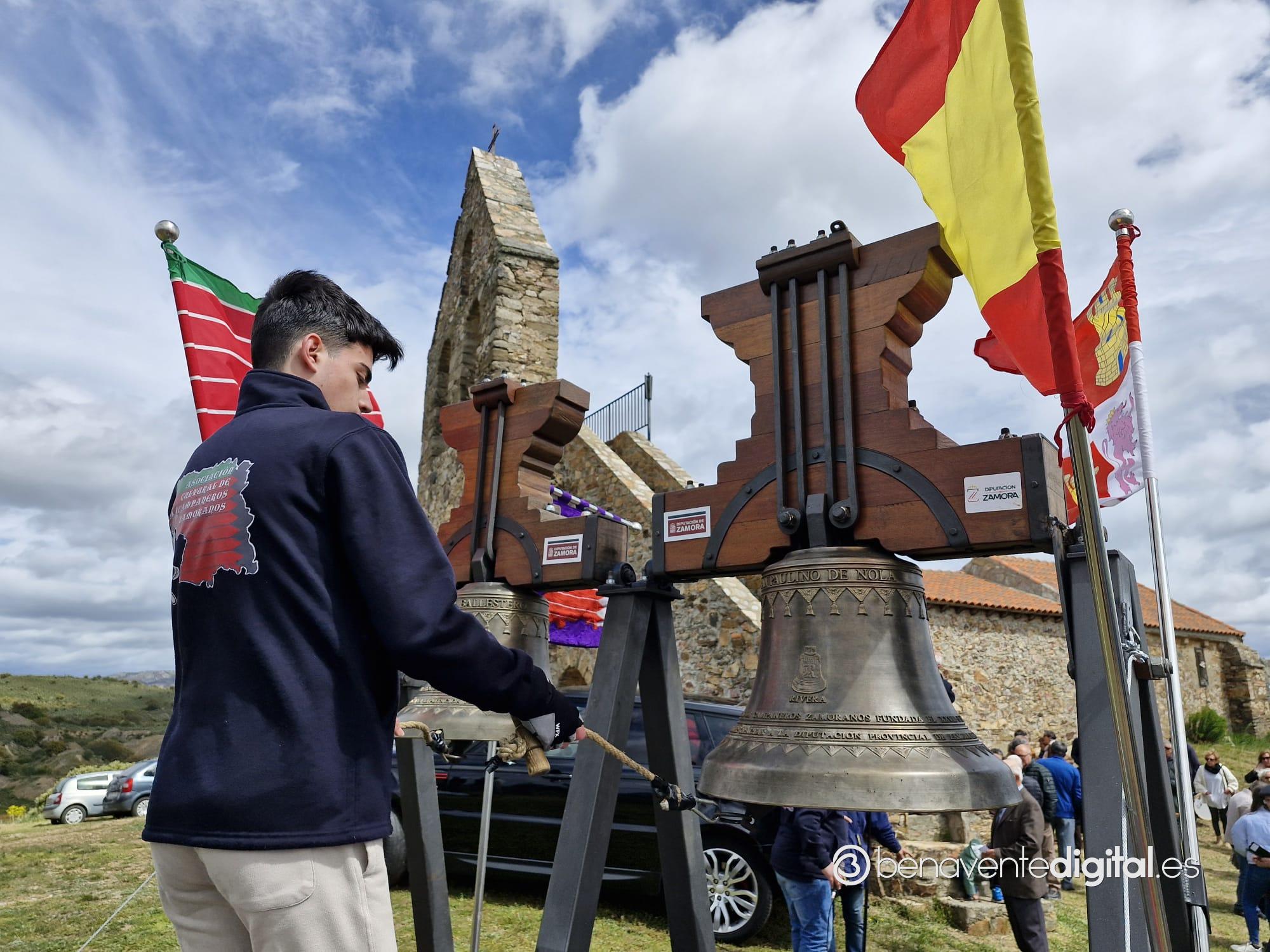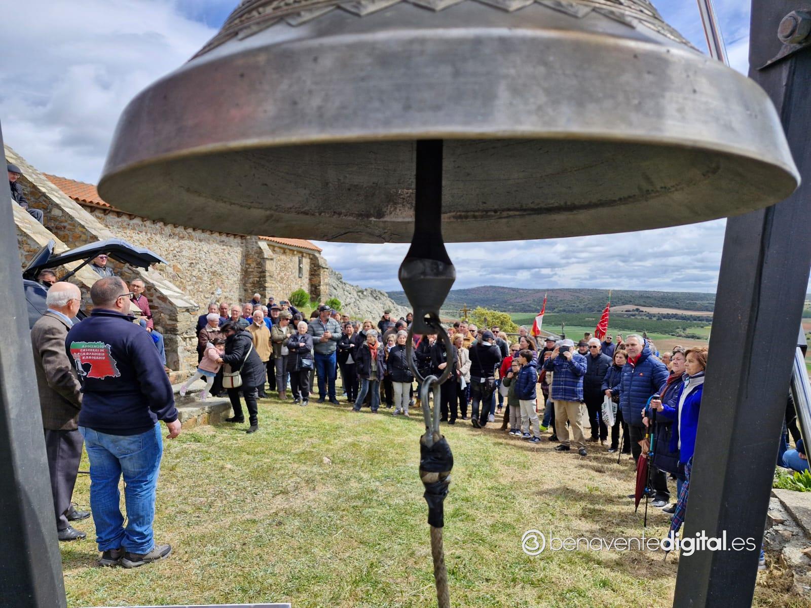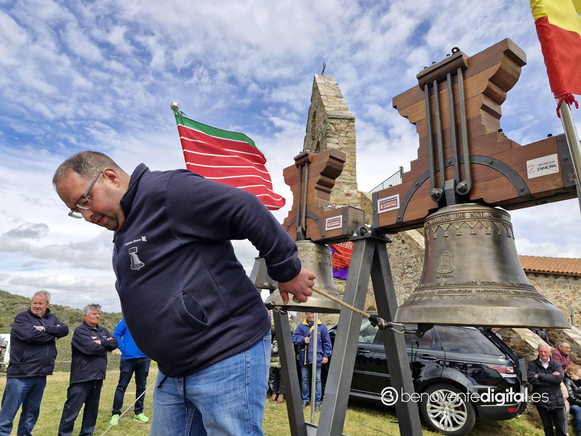 La ermita del mártir San Esteban en Brime de Urz, ubicada en el cerro de las estribaciones de la Sierra de Carpurias que le da nombre, conoció este sábado 4 de mayo y por primera vez en su historia el sonido de las campanas. Los vanos de la espadaña del templo nunca han llegado a estar ocupados por los instrumentos sonoros.