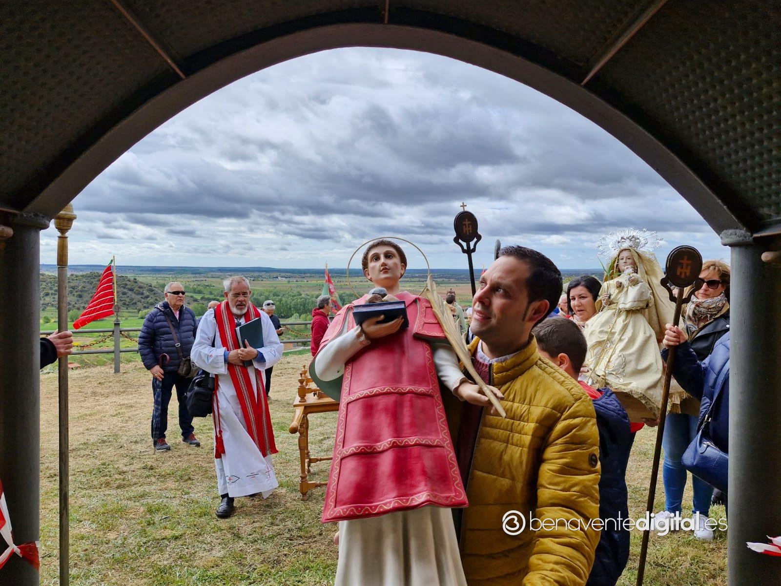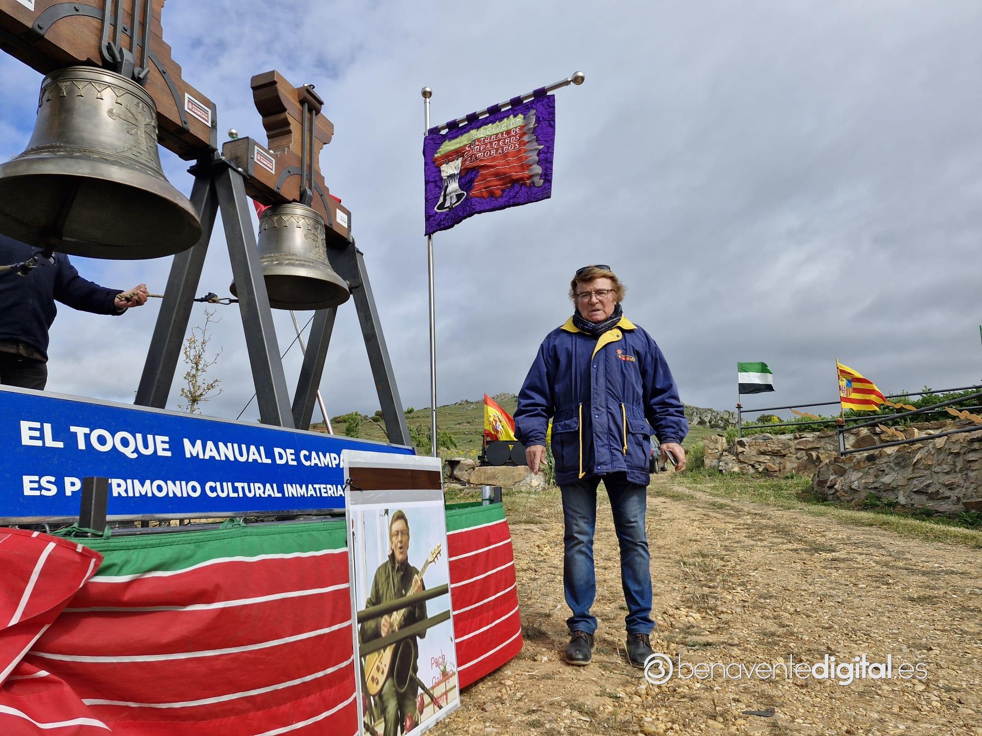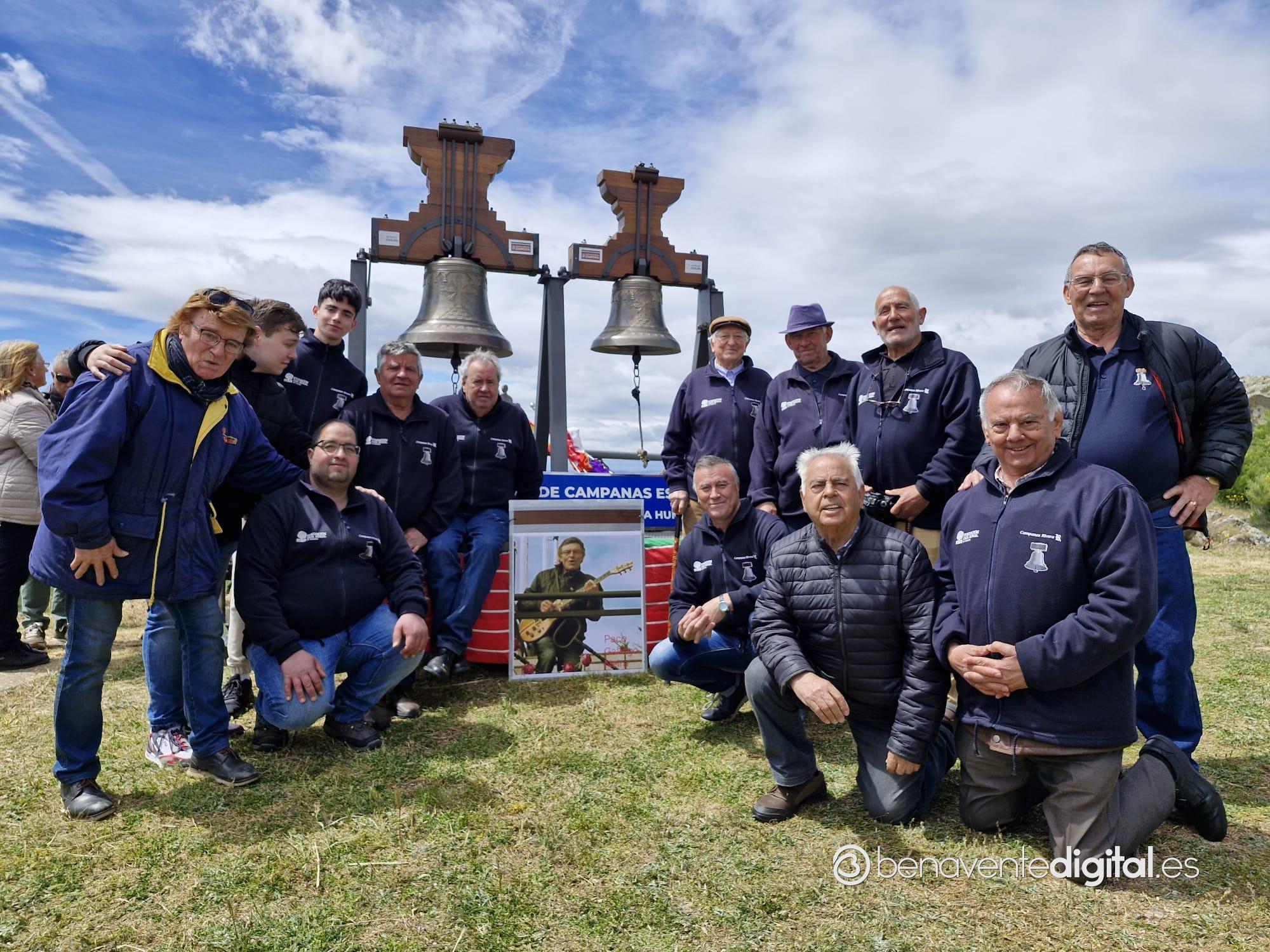 La comitiva procesional continuaba su ascenso hasta la explanada de la ermita, donde a los pies de la espadaña, el párroco Miguel Hernández bendecía la campiña. Los devotos de San Esteban celebraron la misa en su honor y al finalizar la ceremonia religiosa, la privilegiada atalaya o mirador sobre la vega del Almucera servía de escenario para una exhibición de toques de campanas. Los miembros de la asociación campaneros zamoranos rendían así tributo al artista Paco Gallego, haciendo sonar los toques más tradicionales, muchos de ellos recuperados por el activo colectivo de campaneros. Incluso el hermano del homenajeado, Isaac Gallego, del dúo Los Dos Españoles, interpretó «la Molinera» con los toques de los badajos sobre el bronce de las campanas góticas instaladas sobre el campanario móvil. Hasta el lugar se había acercado un representante de la afamada fábrica cacereña de Montehermoso, Campanas Rivera, maestros fundidores desde el siglo XIX, artistas del sonido en bronce. El lema de «Rivera me fecit», Rivera me hizo, se expandió a los cuatro vientos con el volteo de las campanas del representante de Campanas Rivera.