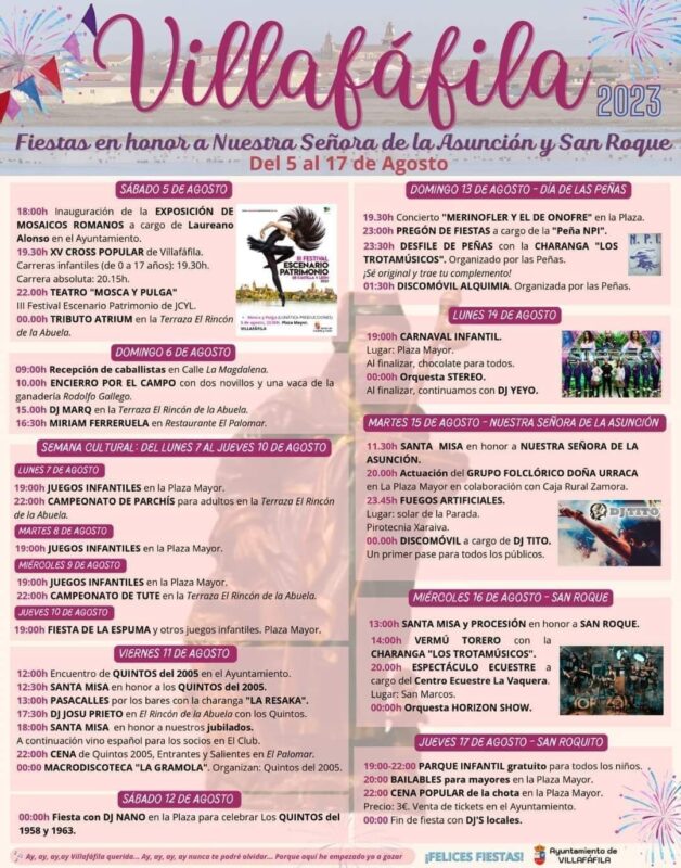 Villafáfila comienza este sábado 5 de agosto los festejos en honor a la Virgen de la Asunción y San Roque Un fin de semana con una exposición de mosaicos romanos, la XV edición del Cross Popular, una representación teatral en el marco del III Festival Escenario Patrimonio de Castilla y León y una velada musical Tributo Atrium constituyen los actos del sábado. El domingo 6 de agosto se organiza un encierro campero y veladas musicales abriendo una semana de actos culturales que dan paso a los festejos de la Virgen de la Asunción y de San Roque.
