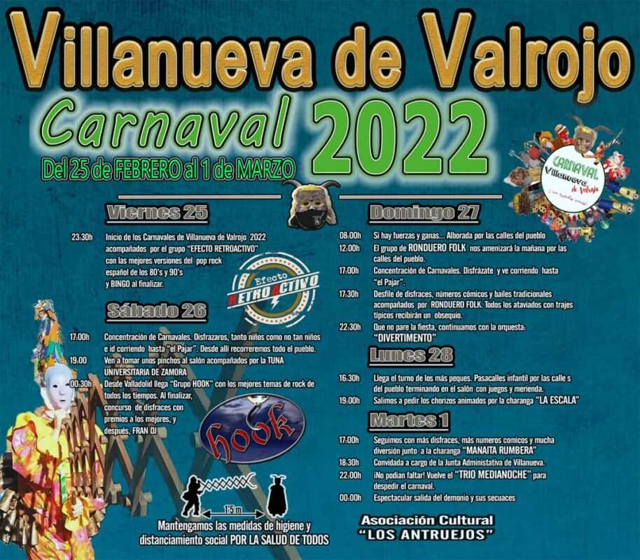 Villanueva de Valrojo retoma los desfiles y fiestas de Carnaval desde el 25 de febrero al martes 1 de marzo. La asociación cultural «los Antruejos» organiza los actos recomendando a los asistentes «mantener las medidas de higiene y distanciamiento social por el bien de todos».