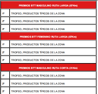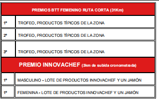 Obtendrán premio los tres primeros y las tres primeras clasificados de la ruta larga y ruta corta de BTT y al equipo con mayor número de integrantes participantes e inscritos.