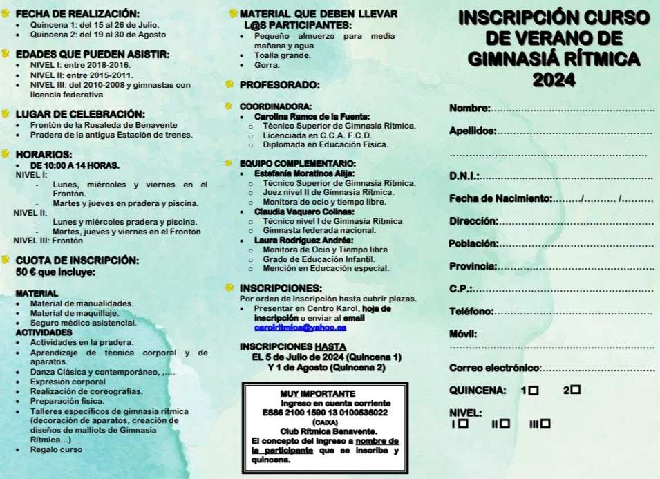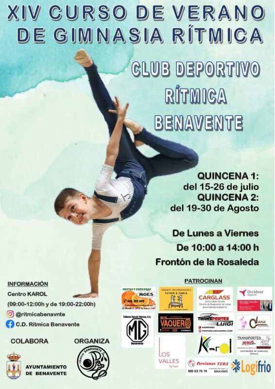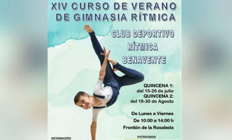 El Club Deportivo Rítmica Benavente invita a todos los jóvenes entusiastas de la gimnasia rítmica a participar en el XIV Curso de Verano, una experiencia única que se llevará a cabo en dos quincenas: del 15 al 26 de julio y del 19 al 30 de agosto de 2024. Este curso intensivo se desarrollará en el Frontón de la Rosaleda de Benavente y la pradera de la antigua estación de trenes.