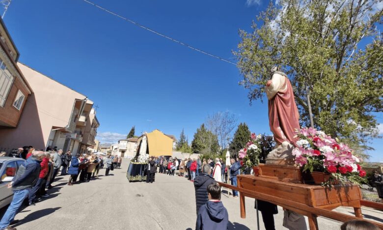 La parroquia de San Juan Bautista, de Santibáñez de Vidriales, celebró este mediodía del Domingo de la Pascua de Resurrección la procesión del Encuentro. El alegre saludo del Señor al encuentro con su madre, la Virgen María.