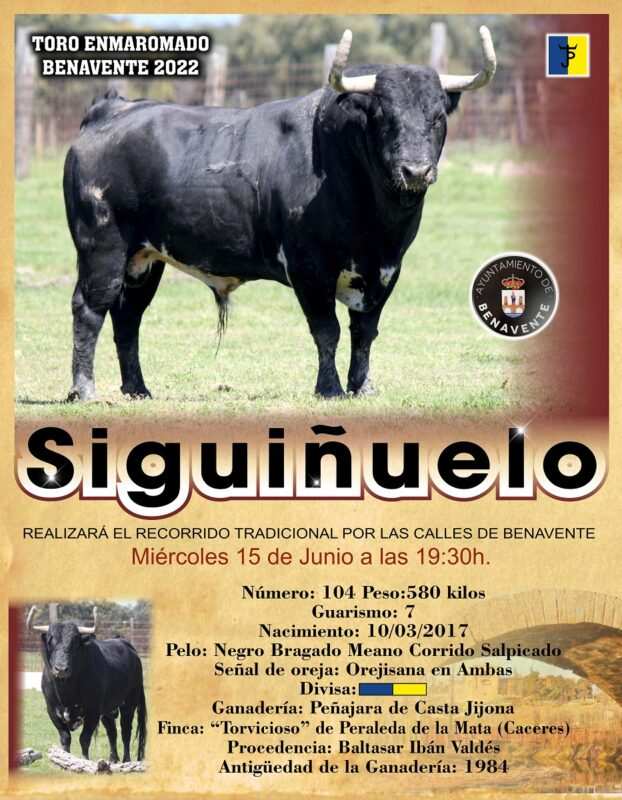 El Ayuntamiento de Benavente informa desde su concejalía de Fiestas que a partir de hoy se pueden recoger en la Oficina de Turismo el cartel ganador del concurso de las Fiestas del Toro Enmaromado, obra de César Núñez y el cartel del Toro Enmaromado 2022 “Siguiñuelo”.