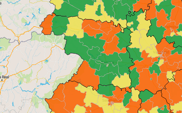 Las zonas básicas de salud que están en naranja son Alta Sanabria, Santibañez de Vidriales, Benavente Norte, Benavente Sur, Bermillo de Sayago, Camarzana de Tera y Villarrín que se ha unido en las últimas horas tras registrar dos nuevas PCR positivas que elevan la incidencia de casos al 5,13%.